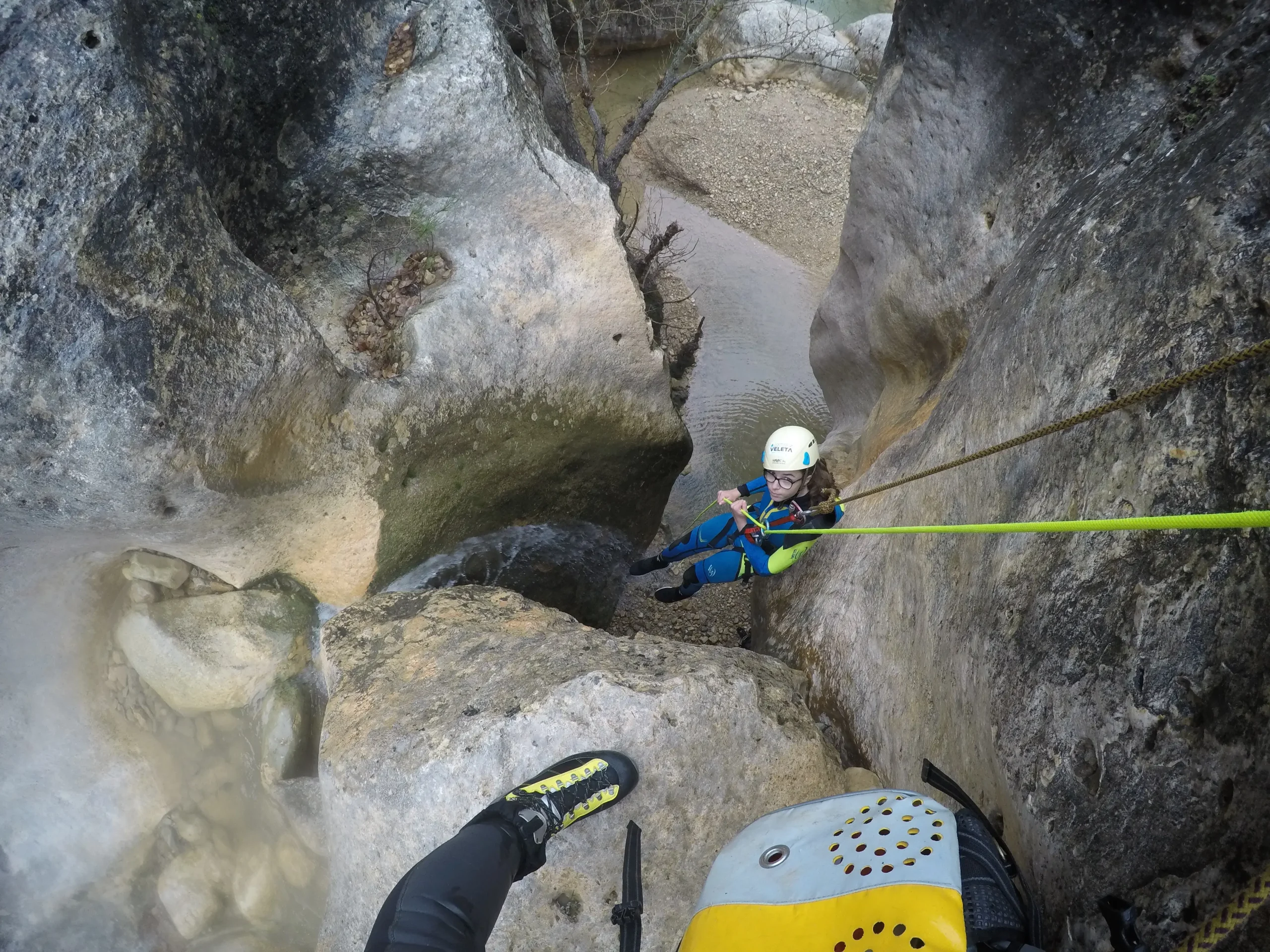El descenso Barranco Portilla es una experiencia acuática completa. La ruta combina progresión por cauce, toboganes y, sobre todo, una sucesión de rápeles que requieren concentración y técnica. Es la opción ideal para grupos de amigos y parejas aventureras que buscan un desafío serio pero muy accesible. La clave del Barranco de la Portilla está en su carácter encajonado, donde la luz se filtra a través de las paredes, creando un ambiente espectacular.